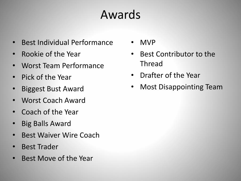 Awards • MVP • Best Contributor to the Thread • Drafter of the Year • Most Disappointing Team • Best Individual Performance • Rookie of the Year • Worst Team Performance • Pick of the Year • Biggest Bust Award • Worst Coach Award • Coach of the Year • Big Balls Award • Best Waiver Wire Coach • Best Trader • Best Move of the Year