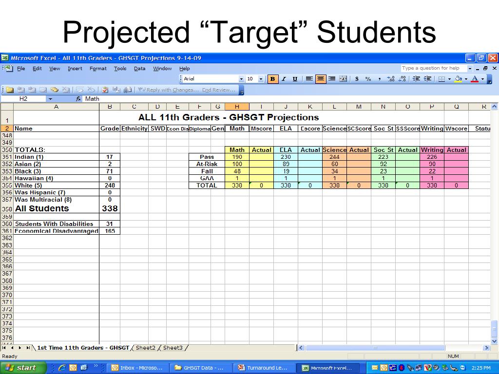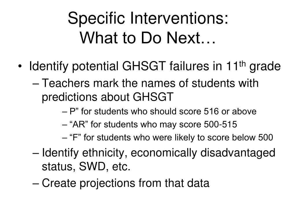Specific Interventions: What to Do Next… • Identify potential GHSGT failures in 11th grade • Teachers mark the names of students with predictions about GHSGT • P” for students who should score 516 or above • “AR” for students who may score 500-515 • “F” for students who were likely to score below 500 • Identify ethnicity, economically disadvantaged status, SWD, etc. • Create projections from that data