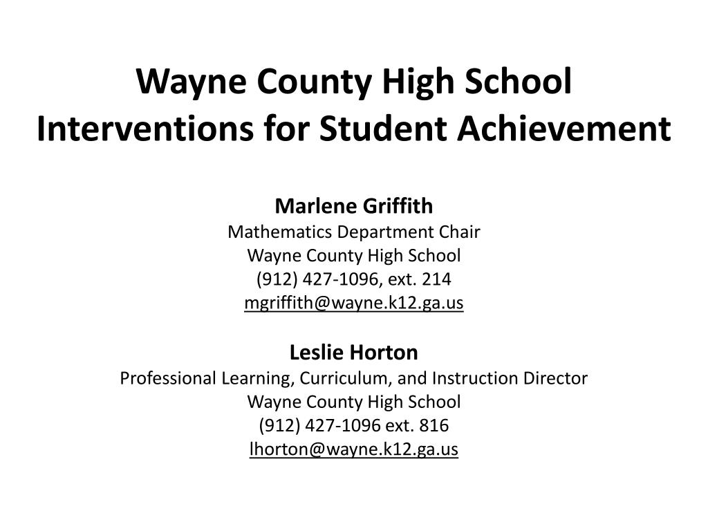 Wayne County High School Interventions for Student Achievement Marlene Griffith Mathematics Department Chair Wayne County High School (912) 427-1096, ext. 214 mgriffith@wayne.k12.ga.us Leslie Horton Professional Learning, Curriculum, and Instruction Director Wayne County High School