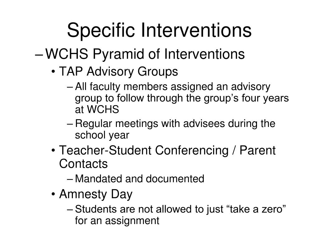 Specific Interventions • WCHS Pyramid of Interventions • TAP Advisory Groups • All faculty members assigned an advisory group to follow through the group’s four years at WCHS • Regular meetings with advisees during the school year • Teacher-Student Conferencing / Parent Contacts • Mandated and documented • Amnesty Day • Students are not allowed to just “take a zero” for an assignment