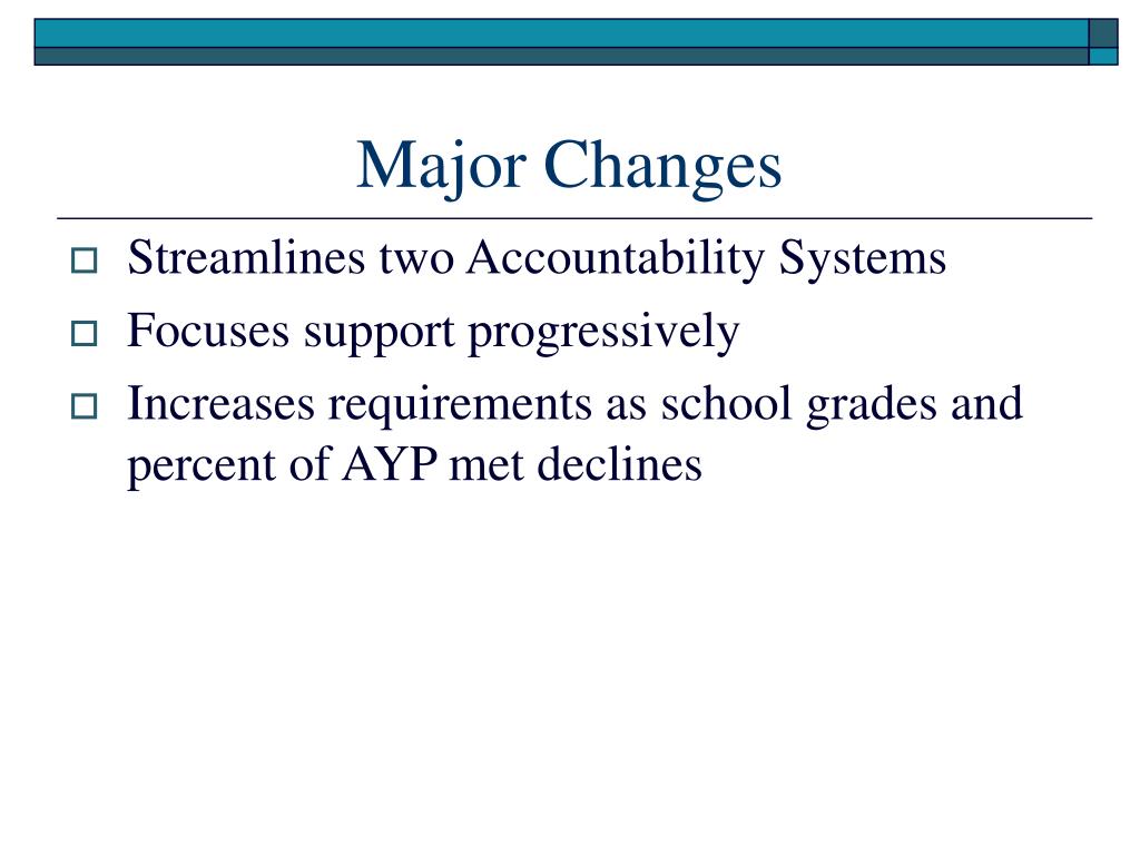 Major Changes • Streamlines two Accountability Systems • Focuses support progressively • Increases requirements as school grades and percent of AYP met declines