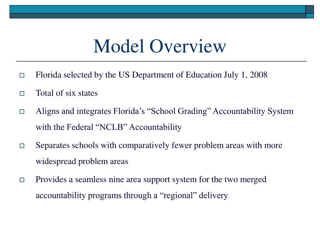 Model Overview • Florida selected by the US Department of Education July 1, 2008 • Total of six states • Aligns and integrates Florida’s “School Grading” Accountability System with the Federal “NCLB” Accountability • Separates schools with comparatively fewer problem areas with more widespread problem areas • Provides a seamless nine area support system for the two merged accountability programs through a “regional” delivery
