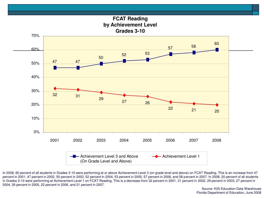 50% 42 38 40% 37 37 39 39 38 38 34 33 33 32 32 33 30% 32 30 20% 10% 0% Achievement Level 3 and Above (On Grade Level and Above) Achievement Level 1 2001 2002 2003 2004 2005 2006 2007 2008 FCAT Reading by Achievement Level Grades 9 and 10 In 2008, 42 percent of all students in Grades 9 and 10 were performing at or above Achievement Level 3 (on grade level and above) on FCAT Reading. This is an increase from 32 percent in 2001, 32 percent in 2002, 33 percent in 2003, 33 percent in 2004, 34 percent in 2005, 37 percent in 2006, and 38 percent in 2007. In 2008, 30 percent of all students in Grades 9 and 10 were performing at Achievement Level 1 on FCAT Reading. This is a decrease from 39 percent in 2001, 39 percent in 2002, 38 percent in 2003, 38 percent in 2004, 37 percent in 2005, 33 percent in 2006, and 32 percent in 2007. Source: K20 Education Data Warehouse Florida Department of Education, June 2008