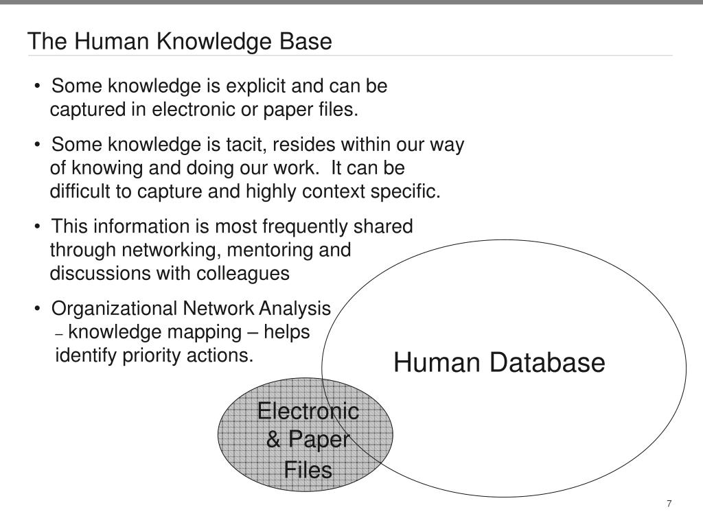 The Human Knowledge Base • Some knowledge is explicit and can be captured in electronic or paper files. • Some knowledge is tacit, resides within our way of knowing and doing our work. It can be difficult to capture and highly context specific. • This information is most frequently shared through networking, mentoring and discussions with colleagues • Organizational Network Analysis – knowledge mapping – helps identify priority actions. Human Database Electronic & Paper Files