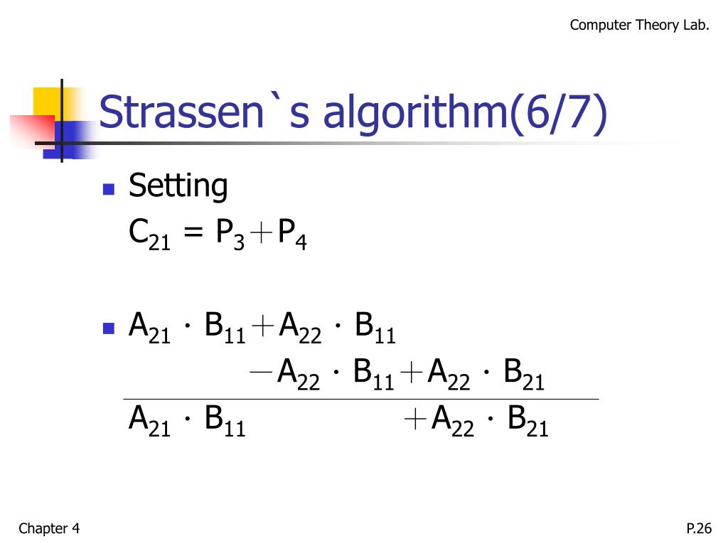 Strassen`s algorithm(6/7) • Setting C21 = P3+P4 • A21.B11+A22.B11 -A22.B11+A22.B21 A21.B11 +A22.B21