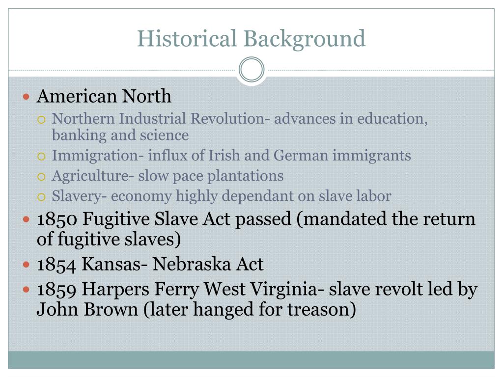 Historical Background • American North • Northern Industrial Revolution- advances in education, banking and science • Immigration- influx of Irish and German immigrants • Agriculture- slow pace plantations • Slavery- economy highly dependant on slave labor • 1850 Fugitive Slave Act passed (mandated the return of fugitive slaves) • 1854 Kansas- Nebraska Act • 1859 Harpers Ferry West Virginia- slave revolt led by John Brown (later hanged for treason)