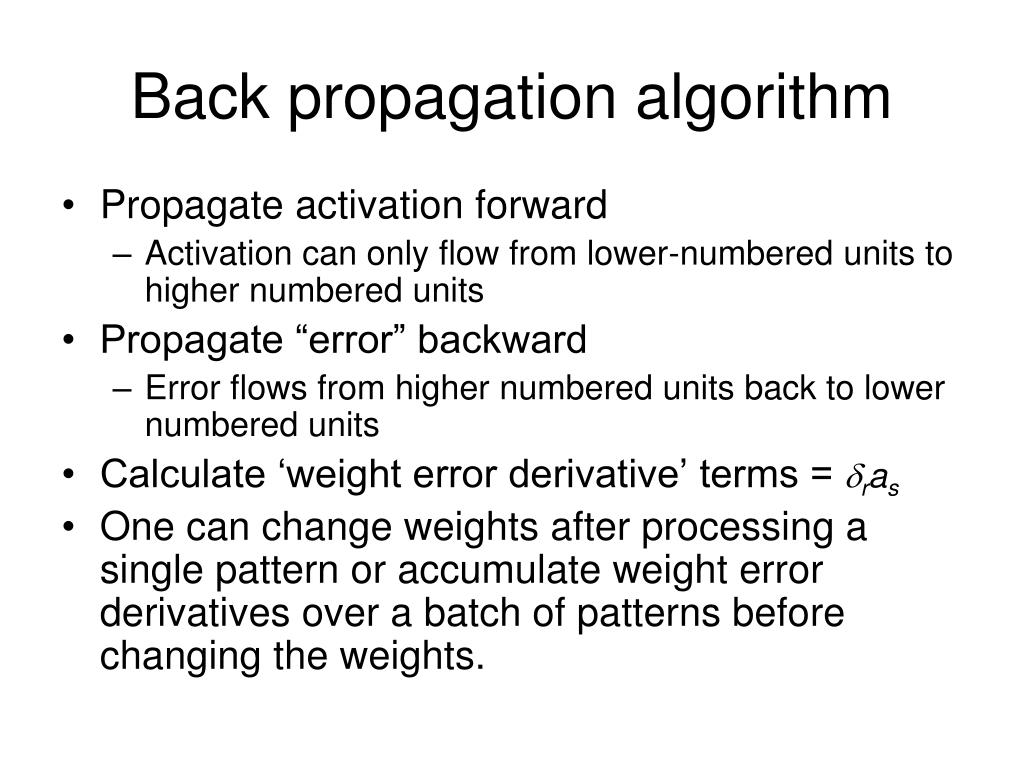 Back propagation algorithm • Propagate activation forward • Activation can only flow from lower-numbered units to higher numbered units • Propagate “error” backward • Error flows from higher numbered units back to lower numbered units • Calculate ‘weight error derivative’ terms = dras • One can change weights after processing a single pattern or accumulate weight error derivatives over a batch of patterns before changing the weights.