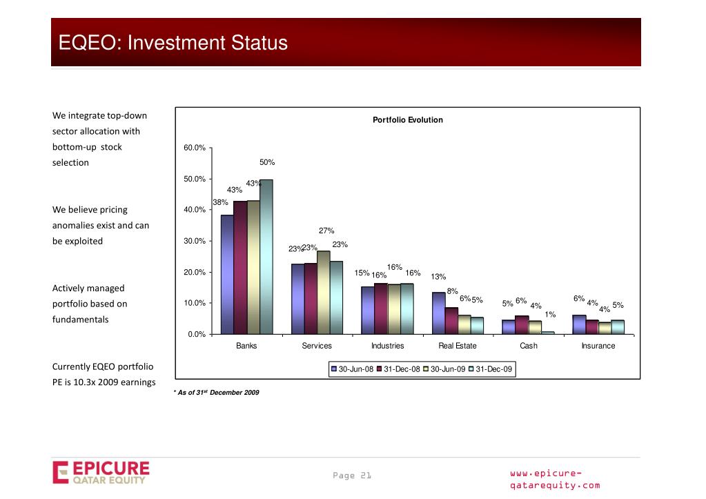 The Company is currently 99.2% invested* Currently, the Company is invested in 19 companies in Qatar, four companies in UAE, and one company in Kuwait. The top five companies constitute 58% of the Company’s NAV EQEO: Investment Status Top Five investments * As of 31st December 2009
