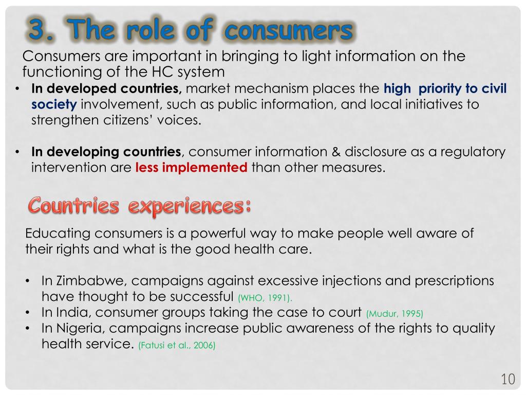 3. The role of consumers Consumers are important in bringing to light information on the functioning of the HC system • In developed countries, market mechanism places the high priority to civil society involvement, such as public information, and local initiatives to strengthen citizens’ voices. • In developing countries, consumer information & disclosure as a regulatory intervention are less implemented than other measures. Countries experiences: • Educating consumers is a powerful way to make people well aware of their rights and what is the good health care. • In Zimbabwe, campaigns against excessive injections and prescriptions have thought to be successful (WHO, 1991). • In India, consumer groups taking the case to court (Mudur, 1995) • In Nigeria, campaigns increase public awareness of the rights to quality health service. (Fatusi et al., 2006)