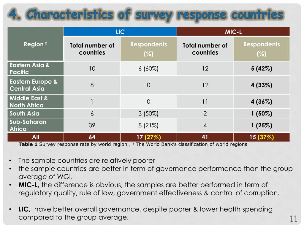 4. Characteristics of survey response countries Table 1 Survey response rateby world region , a The World Bank’s classification of world regions • The sample countries are relatively poorer • the sample countries are better in term of governance performance than the group average of WGI. • MIC-L, the difference is obvious, the samples are better performed in term of regulatory quality, rule of law, government effectiveness & control of corruption. • LIC, have better overall governance, despite poorer & lower health spending compared to the group average.