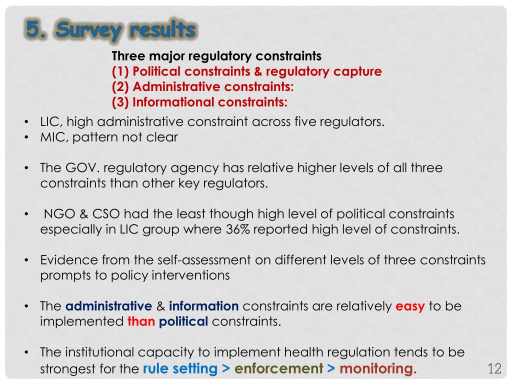 5. Survey results Three major regulatory constraints (1) Political constraints & regulatory capture (2) Administrative constraints: (3) Informational constraints: • LIC, high administrative constraint across five regulators. • MIC, pattern not clear • The GOV. regulatory agency has relative higher levels of all three constraints than other key regulators. • NGO & CSO had the least though high level of political constraints especially in LIC group where 36% reported high level of constraints. • Evidence from the self-assessment on different levels of three constraints prompts to policy interventions • The administrative& informationconstraints are relatively easy to be implemented thanpoliticalconstraints. • The institutional capacity to implement health regulation tends to be strongest for the rule setting > enforcement > monitoring.