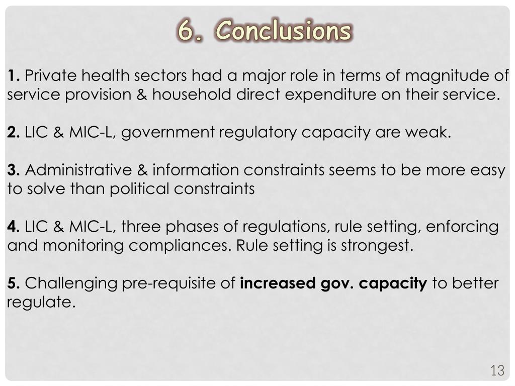 6. Conclusions 1. Private health sectors had a major role in terms of magnitude of service provision & household direct expenditure on their service. 2. LIC & MIC-L, government regulatory capacity are weak. 3. Administrative & information constraints seems to be more easy to solve than political constraints 4. LIC & MIC-L, three phases of regulations, rule setting, enforcing and monitoring compliances. Rule setting is strongest. 5. Challenging pre-requisite of increased gov. capacity to better regulate.