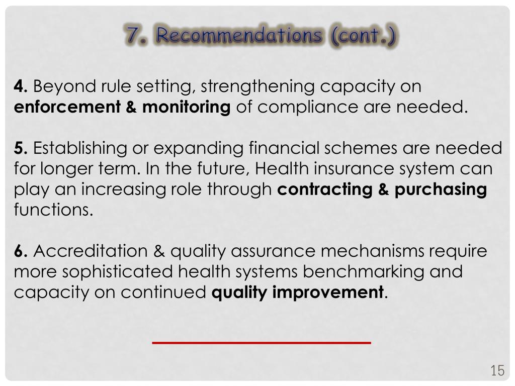 7. Recommendations (cont.) 4. Beyond rule setting, strengthening capacity on enforcement & monitoring of compliance are needed. 5. Establishing or expanding financial schemes are needed for longer term. In the future, Health insurance system can play an increasing role through contracting & purchasing functions. 6. Accreditation & quality assurance mechanisms require more sophisticated health systems benchmarking and capacity on continued quality improvement.