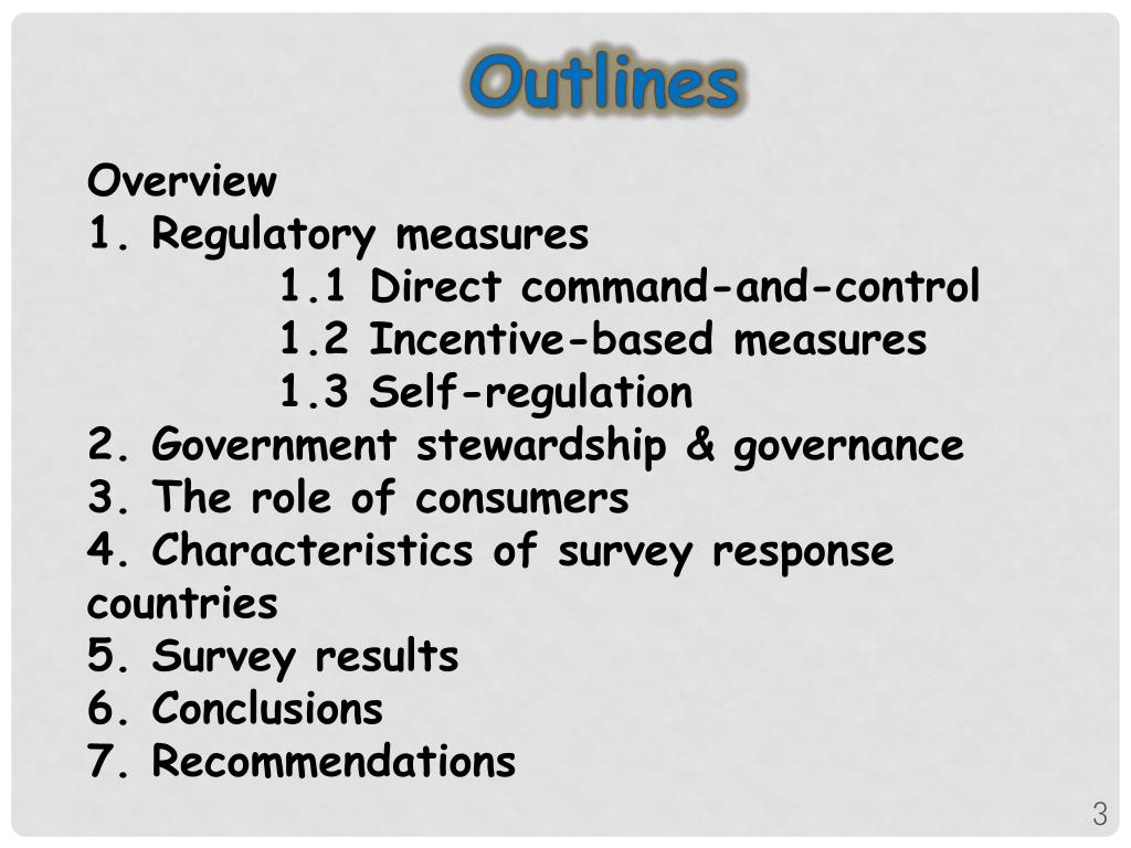 Outlines Overview 1. Regulatory measures 1.1 Direct command-and-control 1.2 Incentive-based measures 1.3 Self-regulation 2. Government stewardship & governance 3. The role of consumers 4. Characteristics of survey response countries 5. Survey results 6. Conclusions 7. Recommendations