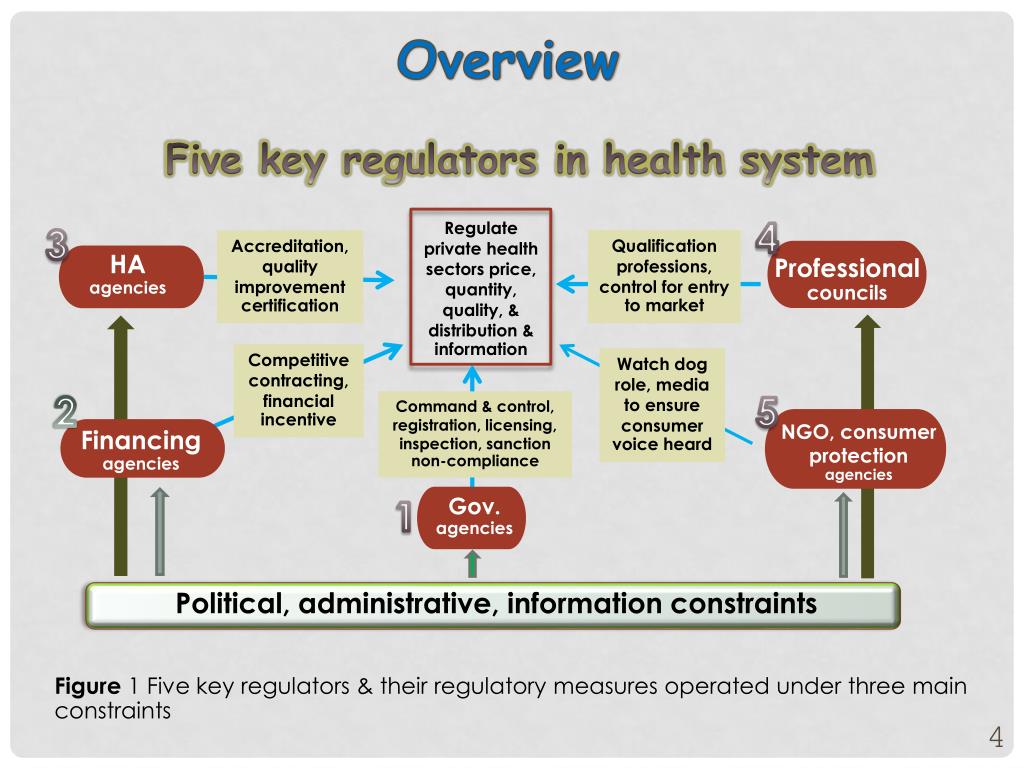 Overview Five key regulators in health system Regulate private health sectors price, quantity, quality, & distribution & information 4 3 Qualification professions, control for entry to market Accreditation, quality improvement certification HA agencies Professional councils Competitive contracting, financial incentive Watch dog role, media to ensure consumer voice heard 2 5 Command & control, registration, licensing, inspection, sanction non-compliance NGO, consumer protection agencies Financingagencies Gov. agencies 1 Political, administrative, information constraints Figure 1 Five key regulators & their regulatory measures operated under three main constraints
