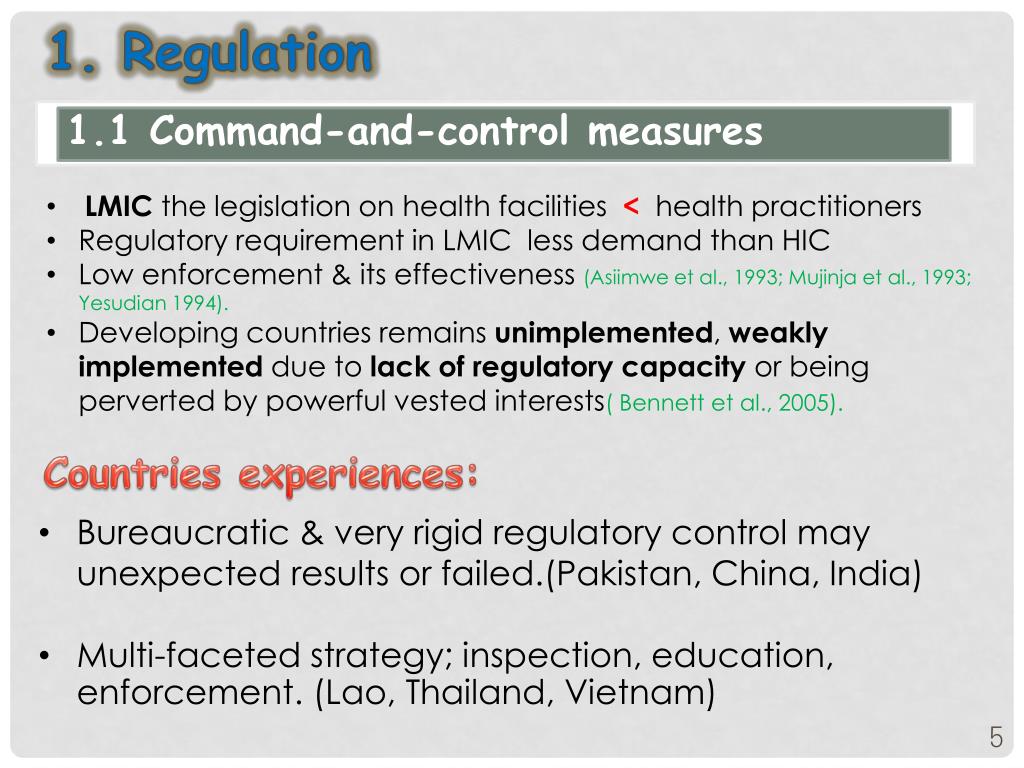1. Regulation 1.1 Command-and-control measures • LMIC the legislation on health facilities < health practitioners • Regulatory requirement in LMIC less demand than HIC • Low enforcement & its effectiveness (Asiimwe et al., 1993; Mujinja et al., 1993; Yesudian 1994). • Developing countries remains unimplemented, weakly implemented due to lack of regulatory capacity or being perverted by powerful vested interests( Bennett et al., 2005). Countries experiences: • Bureaucratic & very rigid regulatory control may unexpected results or failed.(Pakistan, China, India) • Multi-faceted strategy; inspection, education, enforcement. (Lao, Thailand, Vietnam)