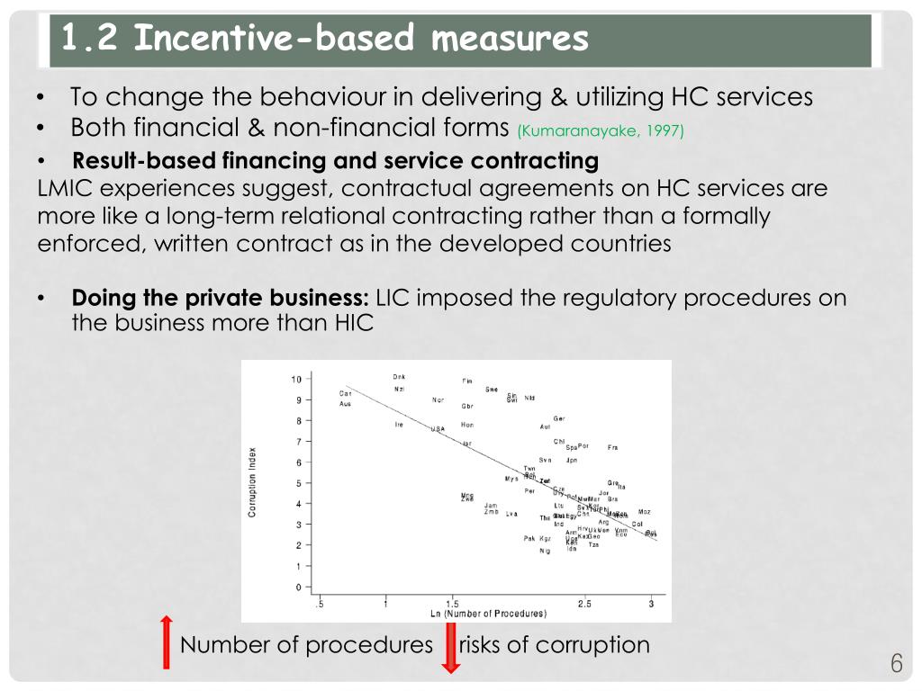 1.2 Incentive-based measures • To change the behaviour in delivering & utilizing HC services • Both financial & non-financial forms (Kumaranayake, 1997) • Result-based financing and service contracting • LMIC experiences suggest, contractual agreements on HC services are more like a long-term relational contracting rather than a formally enforced, written contract as in the developed countries • Doing the private business: LIC imposed the regulatory procedures on the business more than HIC Number of procedures risks of corruption
