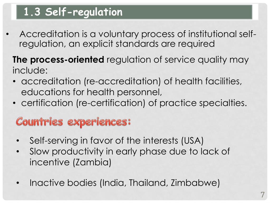 1.3 Self-regulation • Accreditation is a voluntary process of institutional self-regulation, an explicit standards are required • The process-oriented regulation of service quality may include: • accreditation (re-accreditation) of health facilities, educations for health personnel, • certification (re-certification) of practice specialties. Countries experiences: • Self-serving in favor of the interests (USA) • Slow productivity in early phase due to lack of incentive (Zambia) • Inactive bodies (India, Thailand, Zimbabwe)