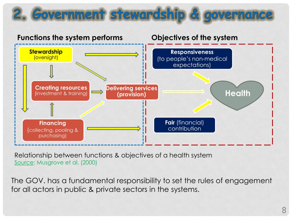 2. Government stewardship & governance Objectives of the system Functions the system performs Stewardship (oversight) Responsiveness (to people’s non-medical expectations) Creating resources (investment & training) Delivering services (provision) Health Fair (financial) contribution Financing (collecting, pooling & purchasing) Relationship between functions & objectives of a health system Source: Musgrove et al. (2000) The GOV. has a fundamental responsibility to set the rules of engagement for all actors in public & private sectors in the systems.