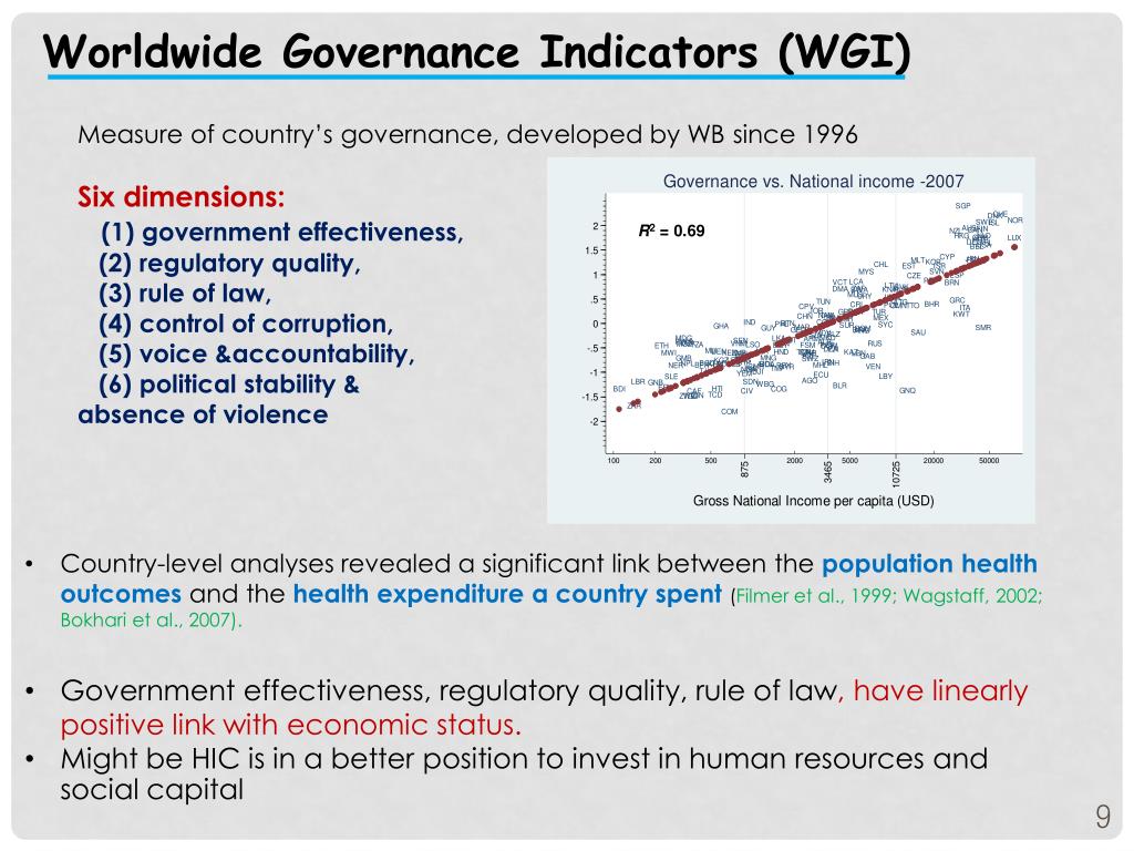 Worldwide Governance Indicators (WGI) Measure of country’s governance, developed by WB since 1996 Six dimensions: (1) government effectiveness, (2) regulatory quality, (3) rule of law, (4) control of corruption, (5) voice &accountability, (6) political stability & absence of violence • Country-level analyses revealed a significant link between the population health outcomes and the health expenditure a country spent (Filmer et al., 1999; Wagstaff, 2002; Bokhari et al., 2007). • Government effectiveness, regulatory quality, rule of law, have linearly positive link with economic status. • Might be HIC is in a better position to invest in human resources and social capital