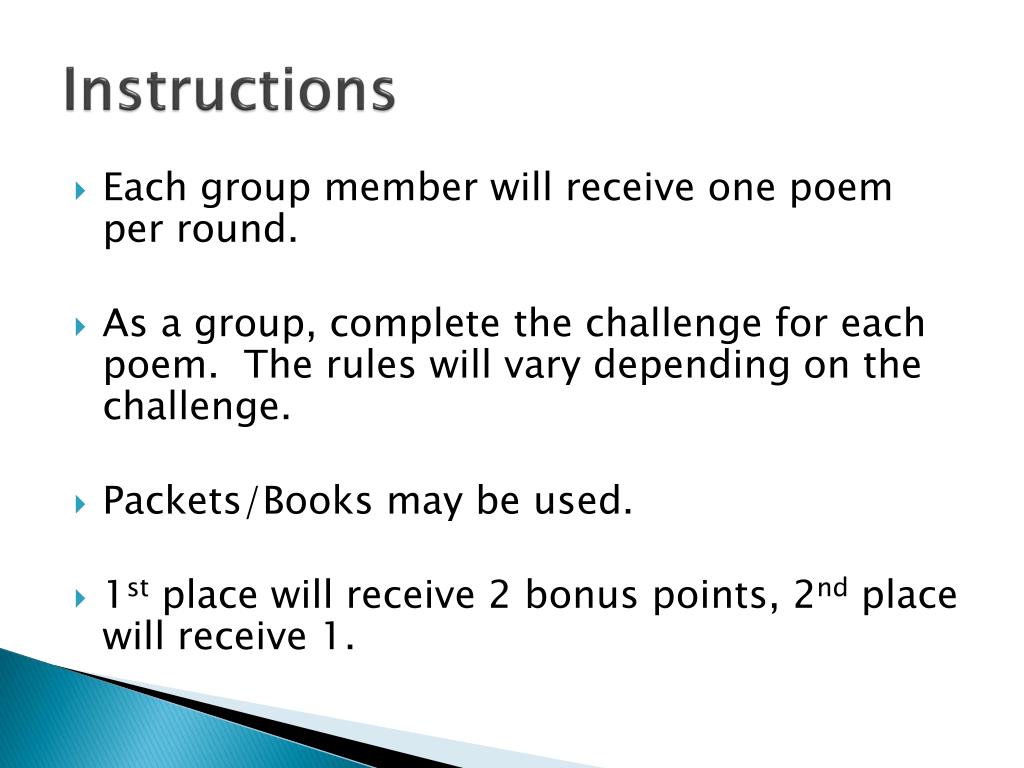 Instructions • Each group member will receive one poem per round. • As a group, complete the challenge for each poem. The rules will vary depending on the challenge. • Packets/Books may be used. • 1st place will receive 2 bonus points, 2nd place will receive 1.