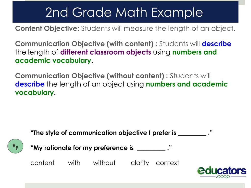 2nd Grade Math Example Content Objective: Students will measure the length of an object. Communication Objective (with content) : Students will describethe length of different classroom objects using numbers and academic vocabulary. Communication Objective (without content) : Students will describethe length of an object using numbers and academic vocabulary. “The style of communication objective I prefer is _________ .” “My rationale for my preference is _________ .” content with without clarity context