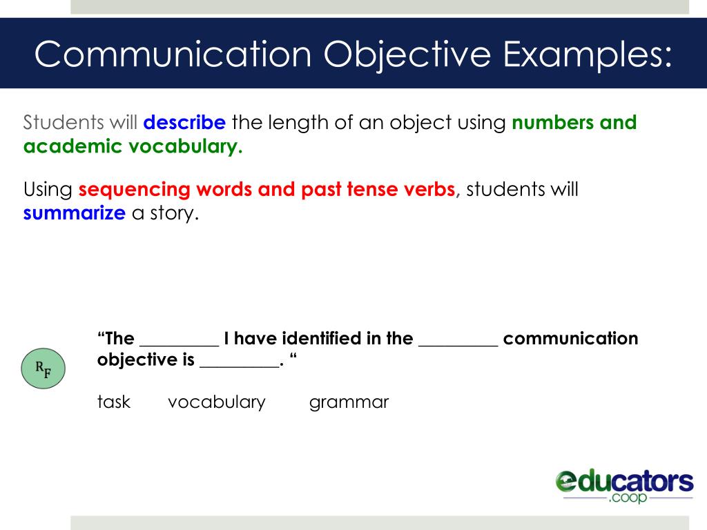 Communication Objective Examples: Students will describe the length of an object using numbers and academic vocabulary. Usingsequencing words and past tense verbs, students will summarizea story. “The _________ I have identified in the _________ communication objective is _________. “ task vocabulary grammar
