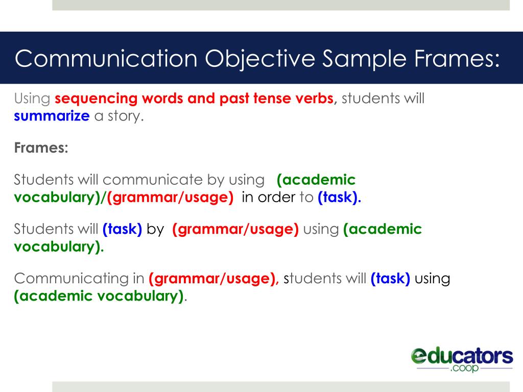 Communication Objective Sample Frames: Usingsequencing words and past tense verbs, students will summarizea story. Frames: Students will communicate by using (academic vocabulary)/(grammar/usage)in order to (task). Students will (task) by(grammar/usage) using (academic vocabulary). Communicating in (grammar/usage),students will (task) using (academic vocabulary).
