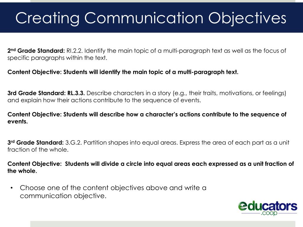 Creating Communication Objectives 2nd Grade Standard: RI.2.2. Identify the main topic of a multi-paragraph text as well as the focus of specific paragraphs within the text. Content Objective: Students will identify the main topic of a multi-paragraph text. 3rd Grade Standard: RL.3.3. Describe characters in a story (e.g., their traits, motivations, or feelings) and explain how their actions contribute to the sequence of events. Content Objective: Students will describe how a character’s actions contribute to the sequence of events. 3rdGrade Standard: 3.G.2. Partition shapes into equal areas. Express the area of each part as a unit fraction of the whole. Content Objective: Students will divide a circle into equal areas each expressed as a unit fraction of the whole. • Choose one of the content objectives above and write a communication objective.
