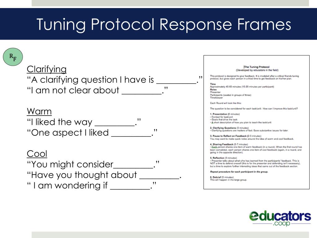 Tuning Protocol Response Frames Clarifying “A clarifying question I have is _________.” “I am not clear about _________.” Warm “I liked the way _________.” “One aspect I liked _________.” Cool “You might consider_________.” “Have you thought about _________. “ I am wondering if _________.”