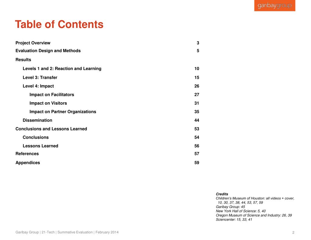 Table of Contents Project Overview3 Evaluation Design and Methods 5 Results Levels 1 and 2: Reaction and Learning10 Level 3: Transfer 15 Level 4: Impact 26 Impact on Facilitators 27 Impact on Visitors 31 Impact on Partner Organizations 35 Dissemination 44 Conclusions and Lessons Learned53 Conclusions 54 Lessons Learned 56 References57 Appendices59 CreditsChildren’s Museum of Houston: all videos + cover, 10, 30, 37, 38, 44, 53, 57, 59 Garibay Group: 45 New York Hall of Science: 5, 40 Oregon Museum of Science and Industry: 26, 39 Sciencenter: 15, 33, 41 Garibay Group | 21-Tech | Summative Evaluation | February 2014