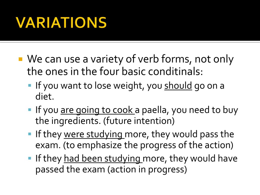 VARIATIONS • We can use a variety of verbforms, notonlytheones in thefourbasicconditinals: • Ifyouwantto lose weight, youshouldgoon a diet. • Ifyouare goingtocooka paella, youneedtobuytheingredients. (futureintention) • Iftheywerestudyingmore, theywouldpasstheexam. (toemphasizetheprogress of theaction) • Iftheyhadbeenstudyingmore, theywouldhavepassedtheexam (action in progress)