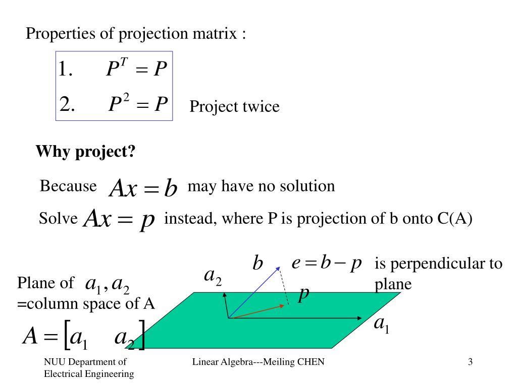 Properties of projection matrix : Project twice Why project? Because may have no solution Solve instead, where P is projection of b onto C(A) is perpendicular to plane Plane of =column space of A Linear Algebra---Meiling CHEN