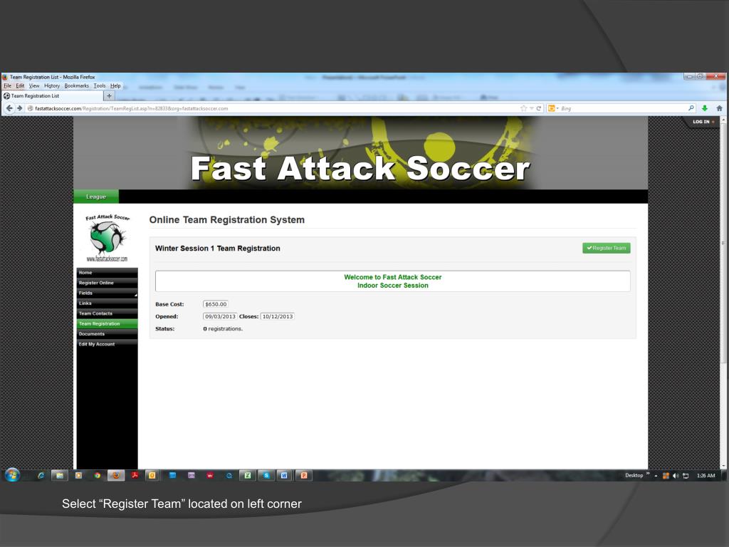 Registration Review. After reviewing select “Register new team” You will receive a confirmation via email of your registration. $100 Deposit required. Please mail check to Tosh Farrell Soccer 16 South Hunt Rd. Unit 4/5 Amesbury, MA 01913