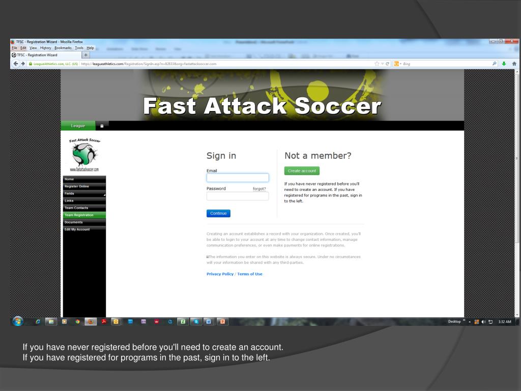 Team Registration. Select Team Registration. Select “Register Team” located on left corner. Select “Continue”. If you have never registered before you'll need to create an account. If you have registered for programs in the past, sign in to the left.