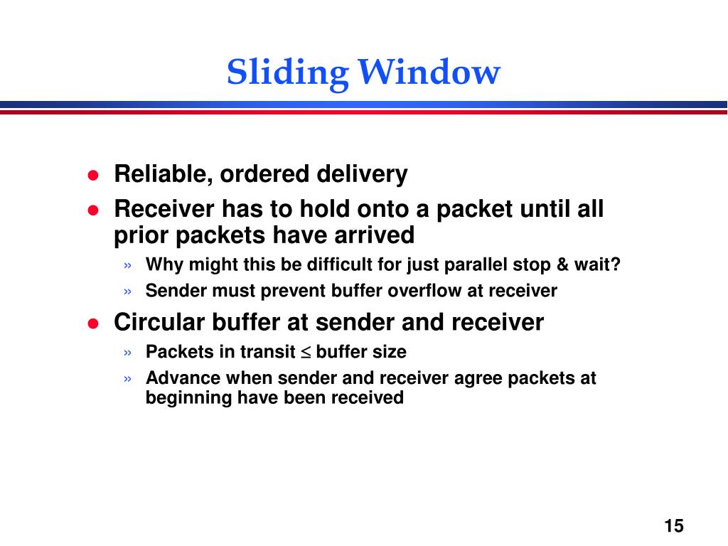 Sliding Window • Reliable, ordered delivery • Receiver has to hold onto a packet until all prior packets have arrived • Why might this be difficult for just parallel stop & wait? • Sender must prevent buffer overflow at receiver • Circular buffer at sender and receiver • Packets in transit buffer size • Advance when sender and receiver agree packets at beginning have been received