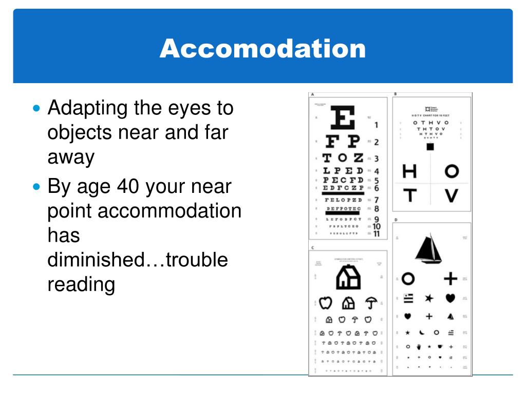 Accomodation • Adapting the eyes to objects near and far away • By age 40 your near point accommodation has diminished…trouble reading