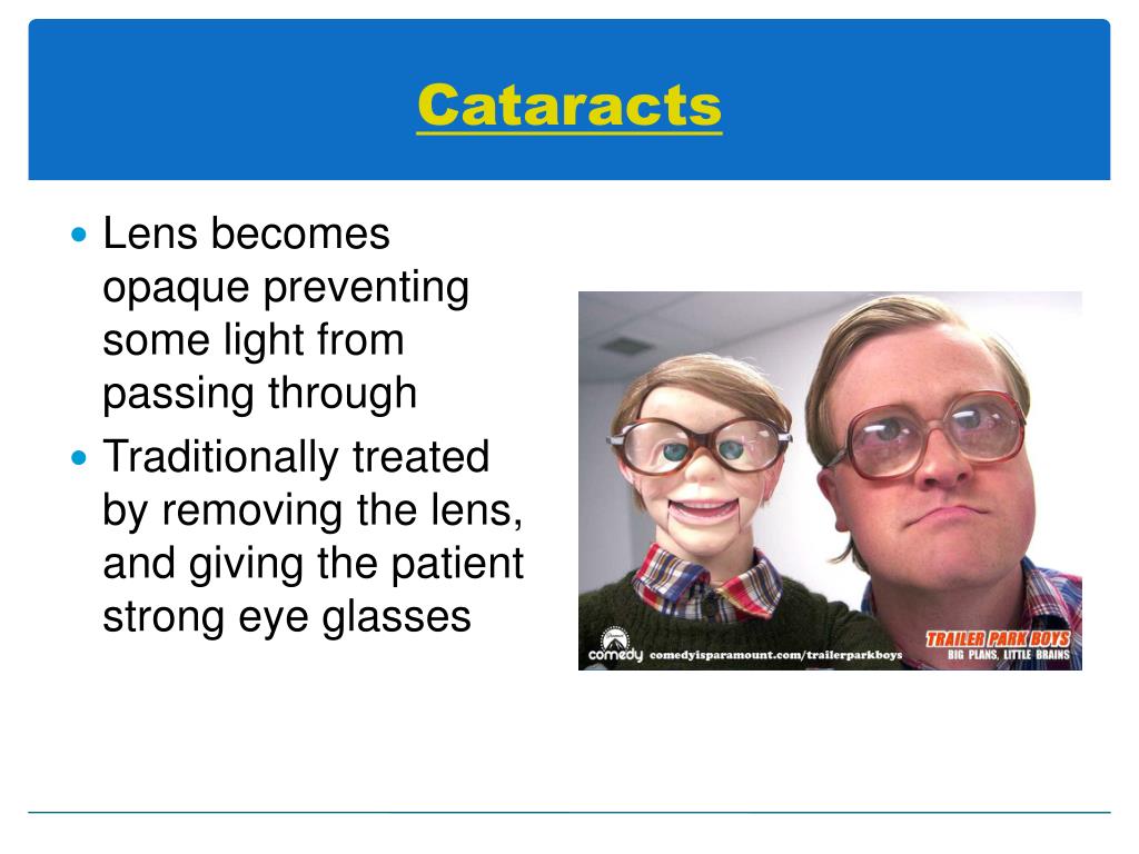 Cataracts • Lens becomes opaque preventing some light from passing through • Traditionally treated by removing the lens, and giving the patient strong eye glasses