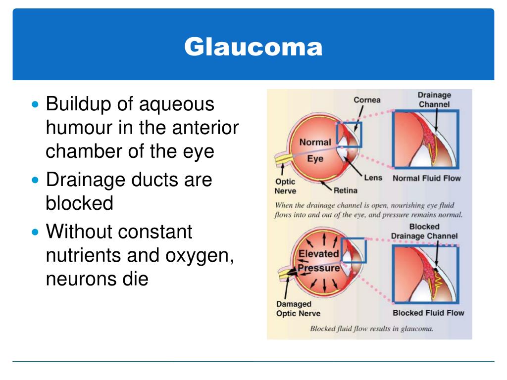 Glaucoma • Buildup of aqueous humour in the anterior chamber of the eye • Drainage ducts are blocked • Without constant nutrients and oxygen, neurons die