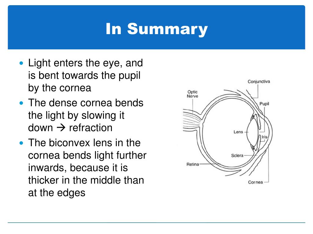 In Summary • Light enters the eye, and is bent towards the pupil by the cornea • The dense cornea bends the light by slowing it down refraction • The biconvex lens in the cornea bends light further inwards, because it is thicker in the middle than at the edges