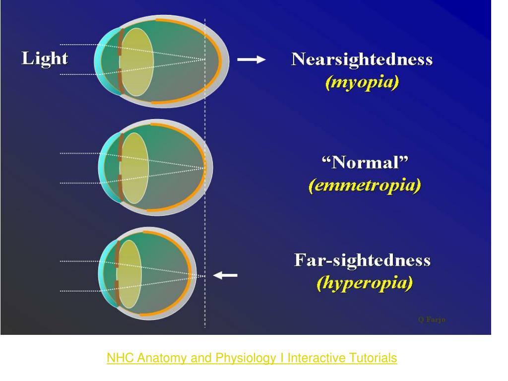 Farsightedness (hyperopia) • Eyeball is too short • Distant images are brought into focus behind the retina • May focus on objects in the distance, but will have trouble seeing near objects