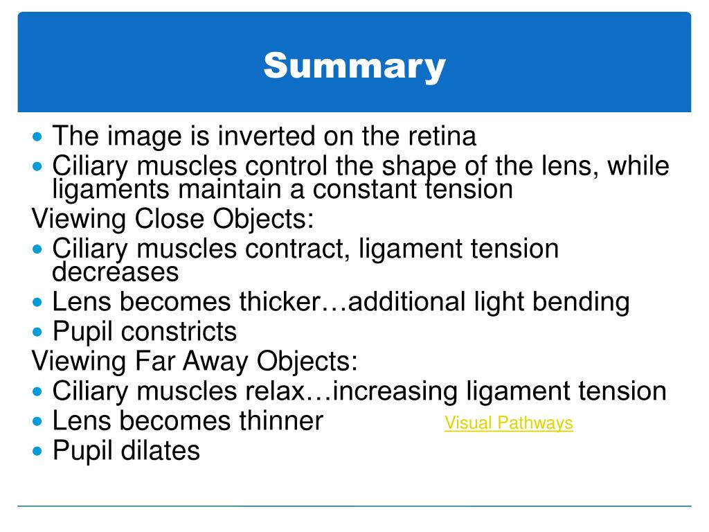 Summary • The image is inverted on the retina • Ciliary muscles control the shape of the lens, while ligaments maintain a constant tension Viewing Close Objects: • Ciliary muscles contract, ligament tension decreases • Lens becomes thicker…additional light bending • Pupil constricts Viewing Far Away Objects: • Ciliary muscles relax…increasing ligament tension • Lens becomes thinner • Pupil dilates Visual Pathways