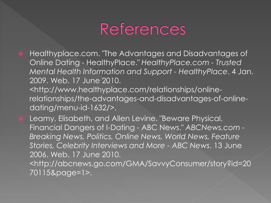 References • Healthyplace.com. "The Advantages and Disadvantages of Online Dating - HealthyPlace." HealthyPlace.com - Trusted Mental Health Information and Support - HealthyPlace. 4 Jan. 2009. Web. 17 June 2010. <http://www.healthyplace.com/relationships/online-relationships/the-advantages-and-disadvantages-of-online-dating/menu-id-1632/>. • Leamy, Elisabeth, and Allen Levine. "Beware Physical, Financial Dangers of I-Dating - ABC News." ABCNews.com - Breaking News, Politics, Online News, World News, Feature Stories, Celebrity Interviews and More - ABC News. 13 June 2006. Web. 17 June 2010. <http://abcnews.go.com/GMA/SavvyConsumer/story?id=2070115&page=1>.
