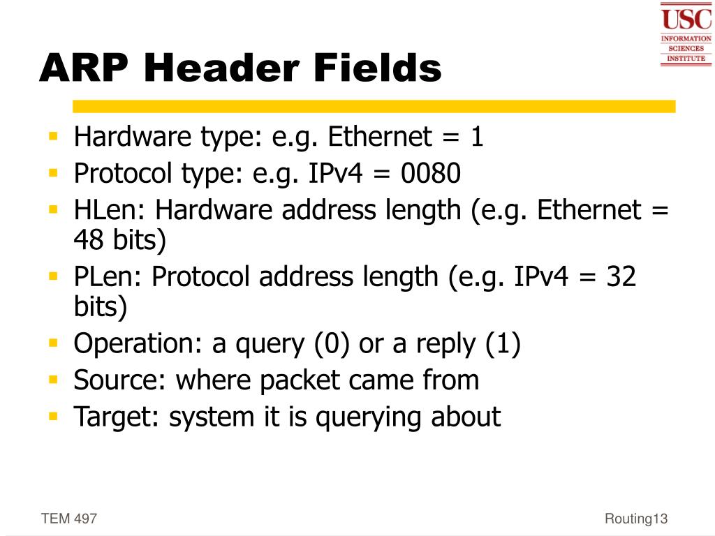 ARP Header Fields • Hardware type: e.g. Ethernet = 1 • Protocol type: e.g. IPv4 = 0080 • HLen: Hardware address length (e.g. Ethernet = 48 bits) • PLen: Protocol address length (e.g. IPv4 = 32 bits) • Operation: a query (0) or a reply (1) • Source: where packet came from • Target: system it is querying about
