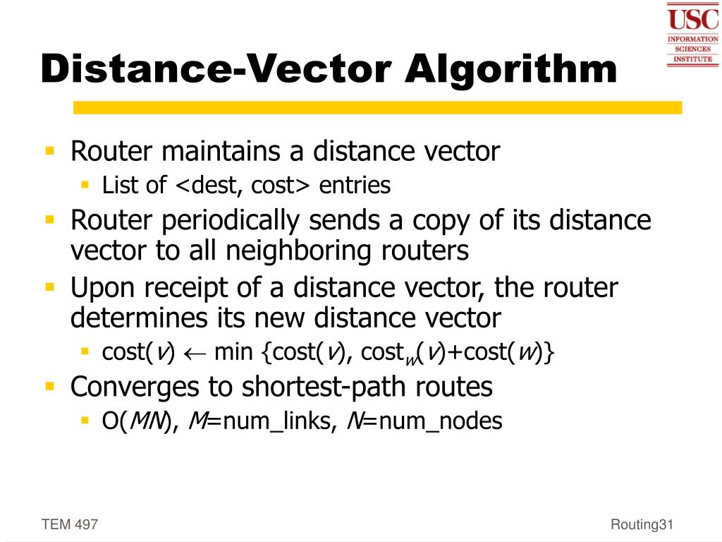 Distance-Vector Routing • Based on the sharing of distance vectors • A router’s distance vector is a list of its “distances” to every other router in the routing domain • Router tells its neighbors its distance (cost) to every other router in the network • Cost = Distance • Usually we assume that cost = distance = hops • Other metrics: bandwidth, delay, charging
