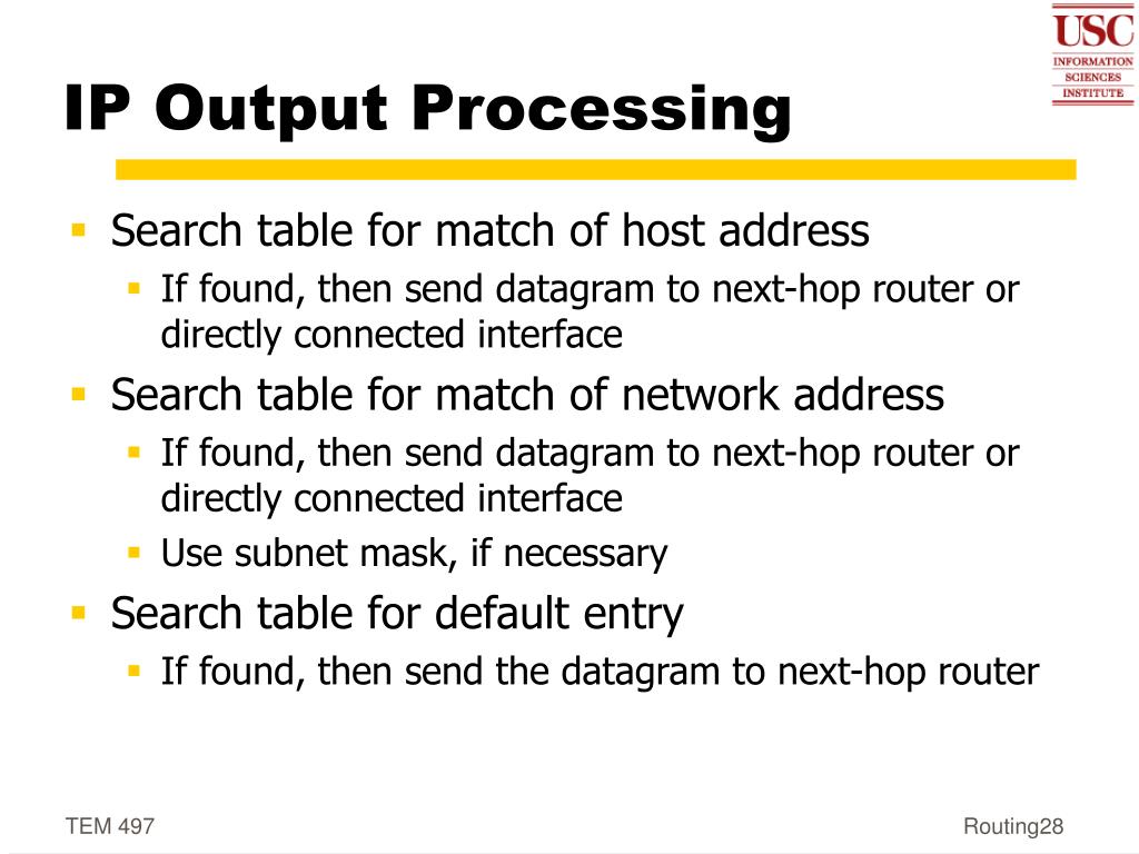 IP Output Processing • Search table for match of host address • If found, then send datagram to next-hop router or directly connected interface • Search table for match of network address • If found, then send datagram to next-hop router or directly connected interface • Use subnet mask, if necessary • Search table for default entry • If found, then send the datagram to next-hop router