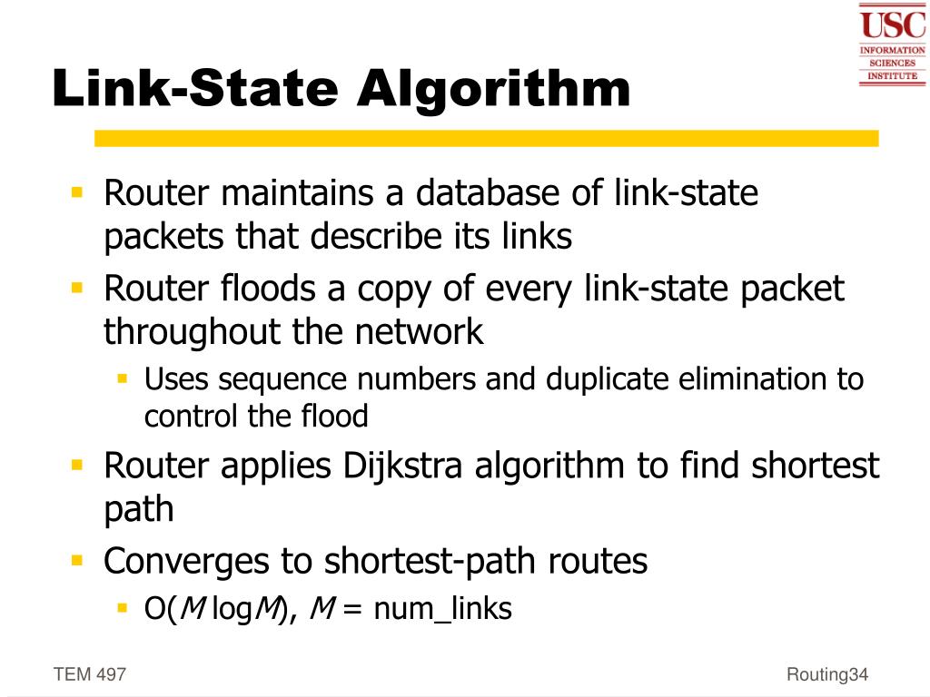 Link-State Algorithm • Router maintains a database of link-state packets that describe its links • Router floods a copy of every link-state packet throughout the network • Uses sequence numbers and duplicate elimination to control the flood • Router applies Dijkstra algorithm to find shortest path • Converges to shortest-path routes • O(M logM), M = num_links