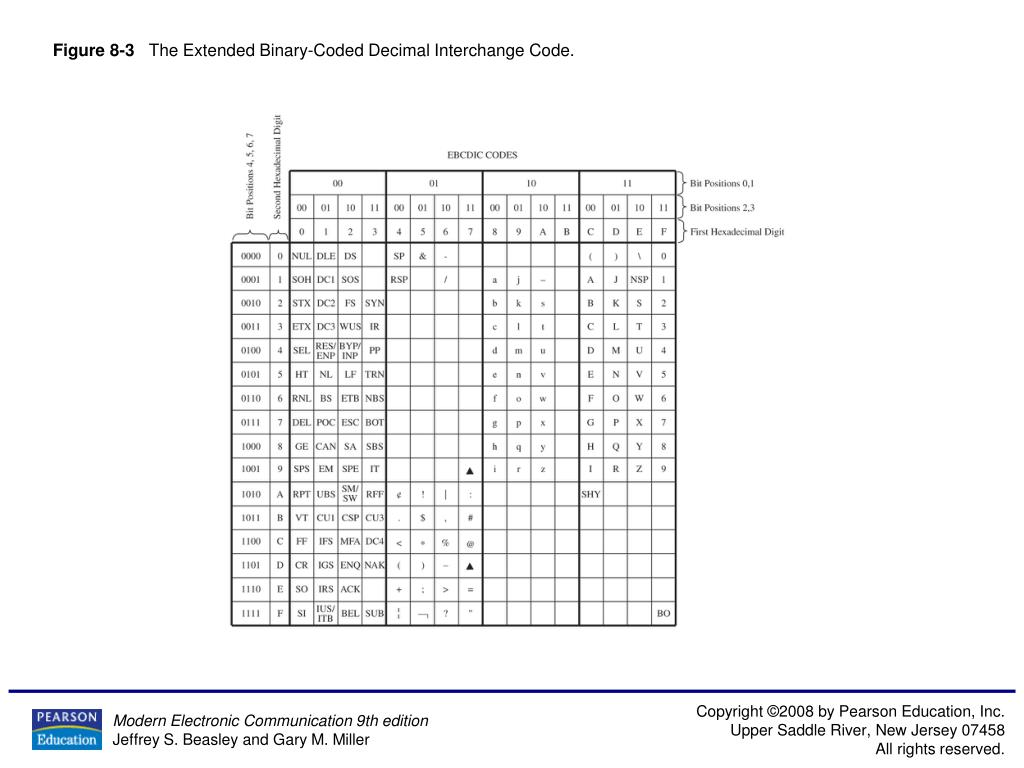 Figure 8-1 Digital/data communications. Figure 8-2 American Standard Code for Information Interchange (ASCII). Figure 8-3 The Extended Binary-Coded Decimal Interchange Code. Figure 8-4 The Baudot code. Figure 8-5 Baudot code examples. Figure 8-6 The Gray code.