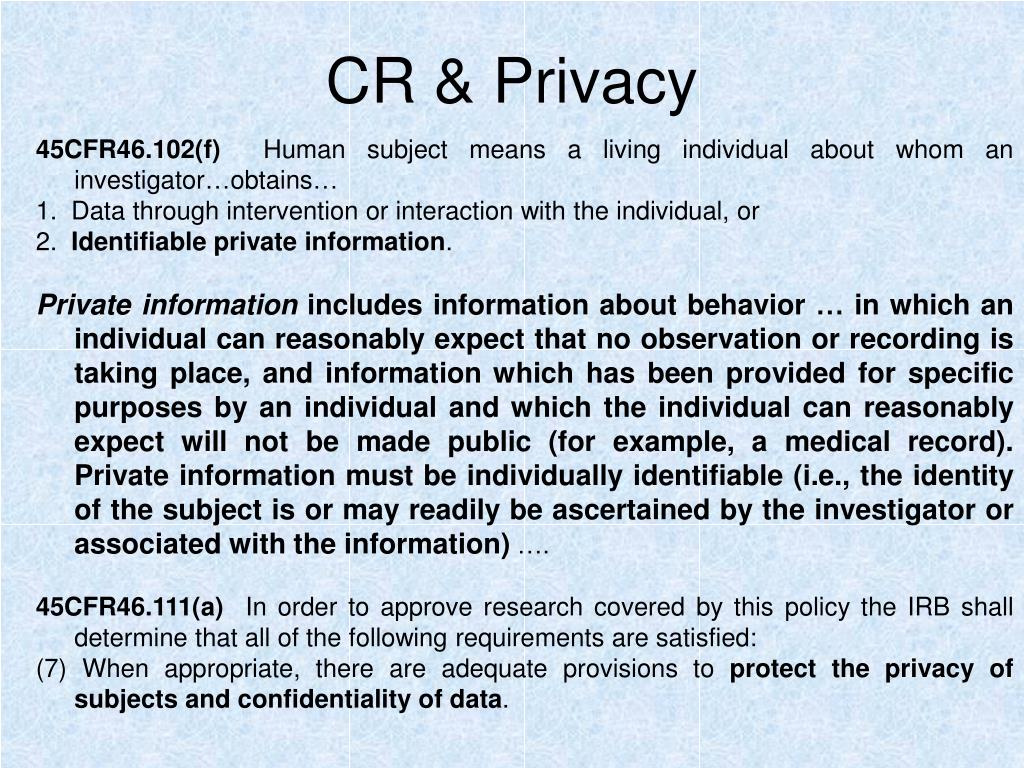 CR & Privacy 45CFR46.102(f) Human subject means a living individual about whom an investigator…obtains… 1. Data through intervention or interaction with the individual, or 2. Identifiable private information. Private information includes information about behavior … in which an individual can reasonably expect that no observation or recording is taking place, and information which has been provided for specific purposes by an individual and which the individual can reasonably expect will not be made public (for example, a medical record). Private information must be individually identifiable (i.e., the identity of the subject is or may readily be ascertained by the investigator or associated with the information) …. 45CFR46.111(a) In order to approve research covered by this policy the IRB shall determine that all of the following requirements are satisfied: (7) When appropriate, there are adequate provisions to protect the privacy of subjects and confidentiality of data.