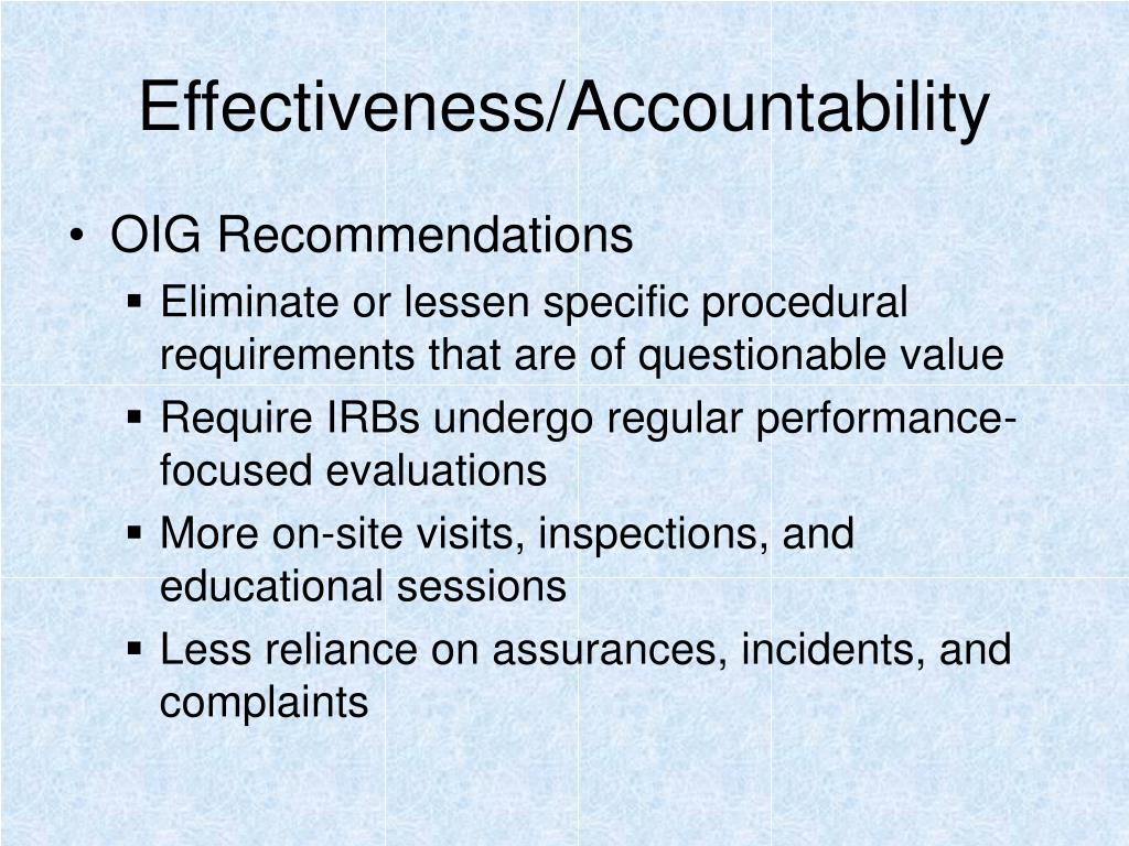 Effectiveness/Accountability • OIG Recommendations • Eliminate or lessen specific procedural requirements that are of questionable value • Require IRBs undergo regular performance-focused evaluations • More on-site visits, inspections, and educational sessions • Less reliance on assurances, incidents, and complaints